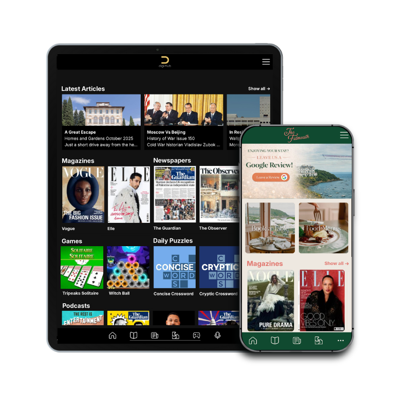 Give your guests & customers access to world-class media, from magazines to newspapers, podcasts, games & puzzles while showcasing your business and services. NO APP NEEDED